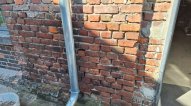 - Am Werkstattanbau des Rechteckschuppens wurde an einer Stelle ein Stück des Mauerwerks probeweise neu verfugt.