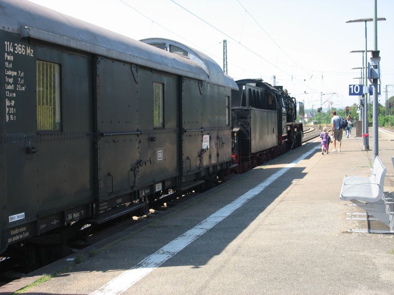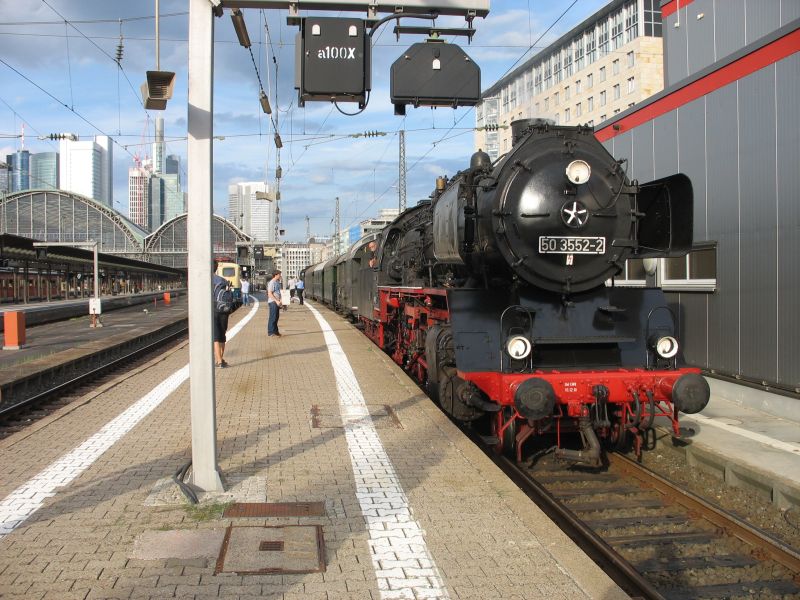 Aus Anlass der Feierlichkeiten zum 125jährigen Jubiläum des Hauptbahnhofs Frankfurt/M wurden am Wochenende 17./18.08.2013 neben vielen weiteren Attraktionen auch eine Fahrzeugausstellung und Pendelfahrten nach Ffm-Höchst bzw. Ffm-Niederrad angeboten. Zuglokomotive des aus historischen Plattformwagen der DME gebildeten Pendelzuges nach Ffm-Höchst war am Samstag, 17.08. unsere 50 3552.