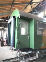 - Für den Wagen 75 911 sind die neuen Gummiwülste eingetroffen. Diese und die Seitenabdeckungen wurden montiert. Die alten, kaputten Dichtprofile wurden demontiert, diese werden ersetzt. Auch die aufgearbeiteten Puffer wurden am lackierten Ende des Wagens wieder angebaut.