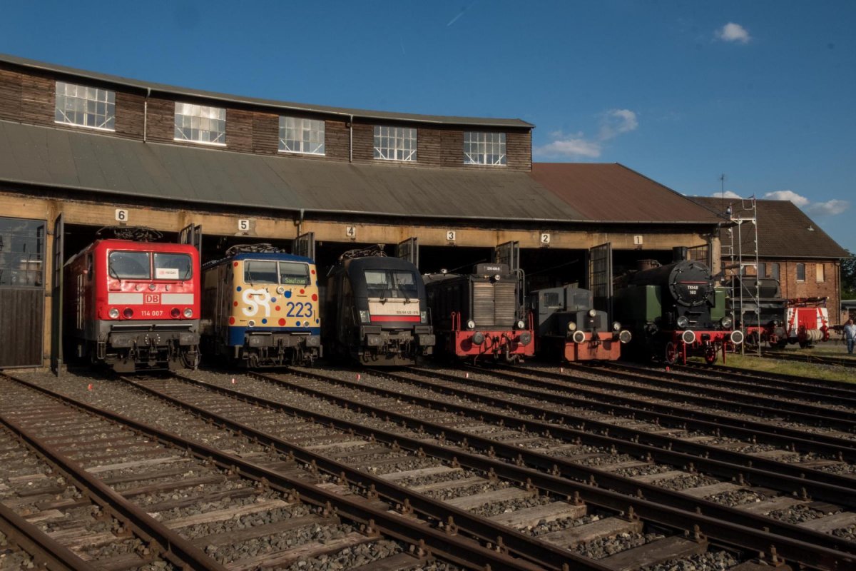 Fahrzeugparaden auf der Drehscheibe sowie Führungen über das Museumsgelände mit sachkundigen Erläuterungen boten informative Inhalte und Einblicke in das historische Bahnbetriebswerk Hanau und die Tätigkeiten der Museumseisenbahn Hanau e. V.