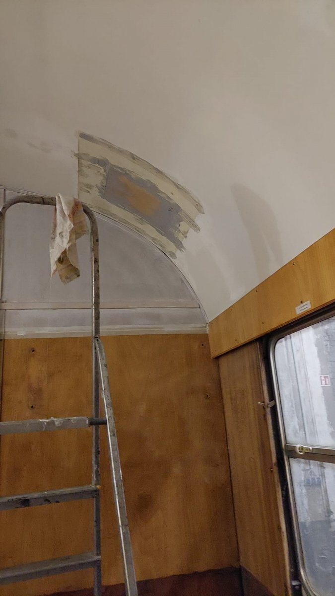 - Die Decke des großen 1.-Klasse-Abteils des Wagens 37 596 wurde nachgeschraubt und gespachtelt.