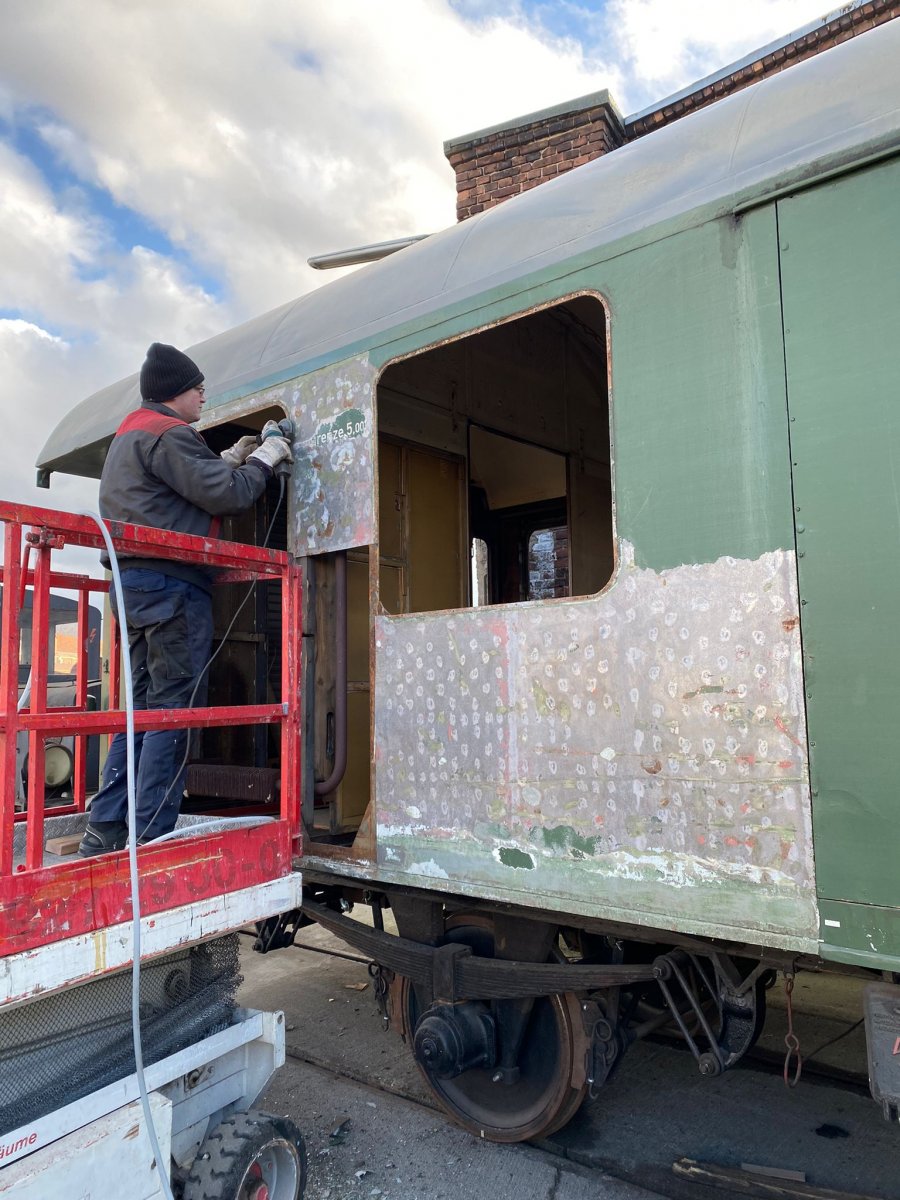 An unserem Halbpackwagen wurde mittlerweile im Packabteil und im Zugführerabteil der gesamte Boden und ein Großteil der Wandverkleidungen zurückgebaut. Das war notwendig, damit die undichten Fensterrahmen und die korrodierten Stahlteile instandgesetzt werden können. Die Fußbodenträger wurden bereits entrostet und grundiert. Die korrodierten Metallteile wurden herausgetrennt und neue Bleche und Profile zum Einbau vorbereitet. Auch wurde der betroffene Teil der Außenseite komplett entlackt und grundiert, da auf dem abblätternden Altlack kein vernünftiger Neuanstrich mehr möglich ist. Für den Wiedereinbau der Wandverkleidung wurden bereits neue Unterkonstruktionshölzer in unserer Schreinerei zugesägt.