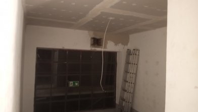 - Im Treppenaufgang der Rechteckschuppen-Anbauten wurde die Decke fertig verspachtelt, geschliffen und gestrichen. Ein überflüssiger Stahlträger wurde abgebrannt und das Loch vermauert. Auch die Beleuchtung wurde montiert.