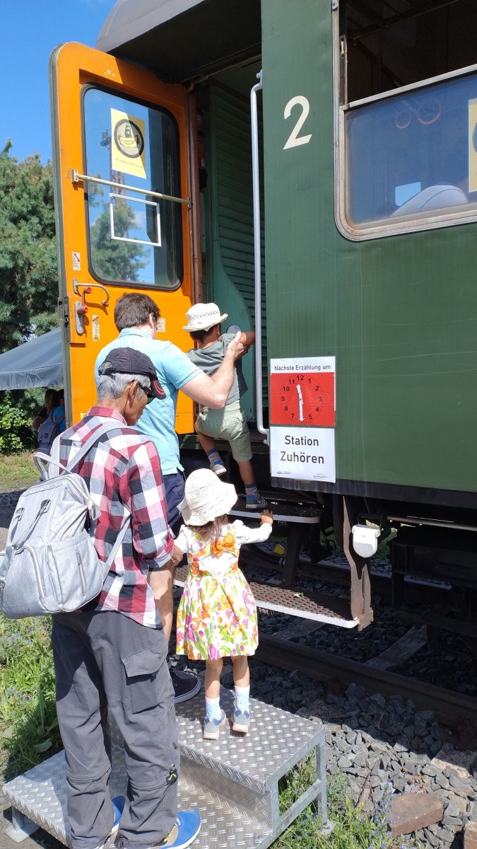 Besonders erfreulich war das rege Interesse an der Hebeldraisine auf Feldbahngleisen, die Mitfahrt auf einer echten Lokomotive sowie dem 5-Zoll-Dampfzug, mit dem die jüngeren Besucherinnen und Besucher eine spannende Reise erleben durften. Die kleinen Eisenbahner bewiesen sowohl Geduld als auch Geschick beim Rangieren auf einer Modellbahnanlage, beim Zusammenbau eines Gleises, beim Ausmalen von Bildern sowie beim Erschaffen von fantasievollen Bauwerken mit tausenden Legosteinen. Im vollbesetzten Eisenbahnwaggon lauschten die kleinen Besucher gespannt den Erzählungen oder schauten im Lokschuppen den Zügen auf der Spur 0e-Billerbahn nach. Ebenfalls im Lokschuppen war jeder richtig, der eine Stärkung, ein Getränk oder einfach eine Verschnaufpause brauchte.