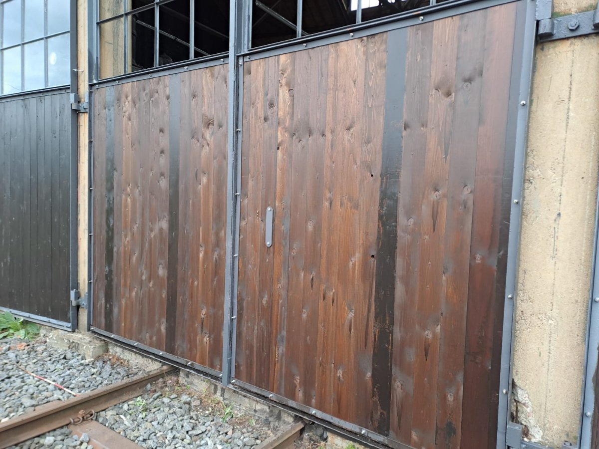 - Die Holzfüllung des Lokschuppentors am Lokschuppen Nord, Gleis 6 wurde nochmals gestrichen und hat wieder die Verriegelung und die Klemmleisten der Holzfüllung erhalten.