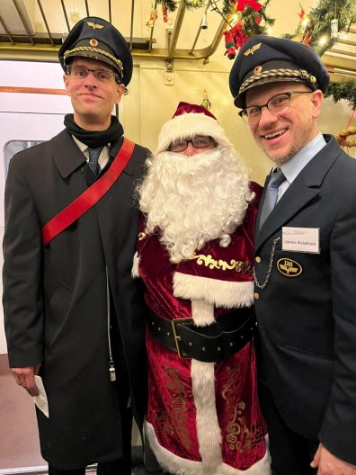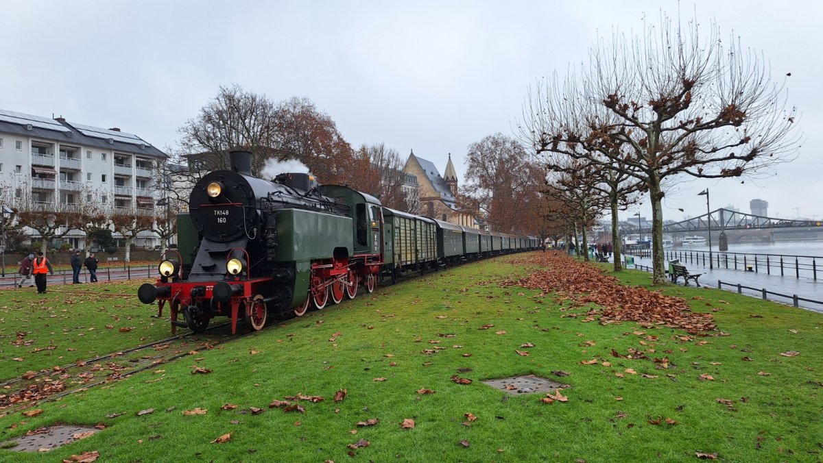 Der Zug bestand aus unseren Umbauwagenzug. Zum ersten Mal war auch unser frisch restaurierter Halbgepäckwagen (BD3yg) und unser Neuzugang, ein vierachsiger Umbauwagen (B4yg), mit dabei. Von Hanau Hbf gingen die Fahrten über Maintal-Ost nach Frankfurt/M Ost. Auf diesem Streckenabschnitt wurde der Zug von der polnischen Dampflok TKt 48-160, welche im historischen Bahnbetriebswerk Hanau beheimatet ist, zusammen mit der Diesellok V60 447 gezogen. In Frankfurt/M Ost wechselte die Diesellok ans andere Zugende und nach einem Rangiermanöver zog die Dampflok dann den Zug alleine über die Städtische Hafenbahn Frankfurt bis zur Haltestelle Eiserner Steg, wo die Fahrgäste ausstiegen. Der Zug fuhr dann weiter in die Grünanlage, um den Zugang zwischen Eisernen Steg und dem Weihnachtsmarkt freizumachen und die Dampflok mit Wasser zu versorgen. Während der Fahrten erhielten die Kinder im Zug von unserer Weihnachtsfrau ein kleines Präsent.