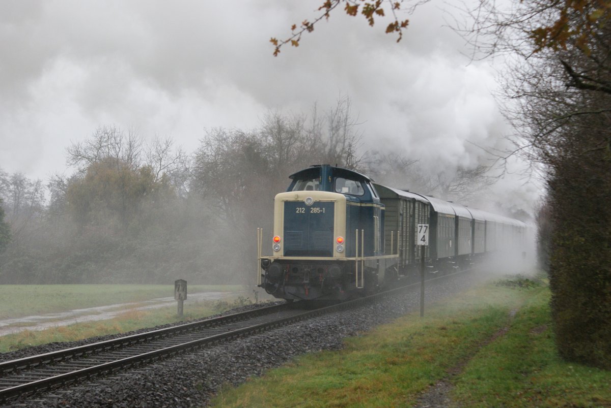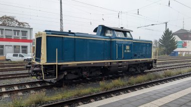 Einzige sinnvolle Umleitungsmöglichkeit war nun die Fahrt über Seligenstadt und Babenhausen, um dann ab Aschaffenburg wieder den regulären Fahrtweg nutzen zu können. Die Umleitung brachte natürlich entsprechend längere Fahrzeiten mit sich, sodaß wir uns entschieden, mit einer zweiten Lokomotive zu fahren, um jeweils das Umsetzen zu vermeiden und somit die Wendezeiten zwischendurch kurz zu halten. Dankenswerterweise konnten wir kurzfristig bei der KonRail GmbH eine Diesellok der Baureihe V 100 (sogar in historischem Farbbild) organisieren. So dass auf Teilstrecken entweder die Dampflok oder die Diesellok den Zug zog.