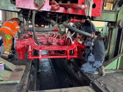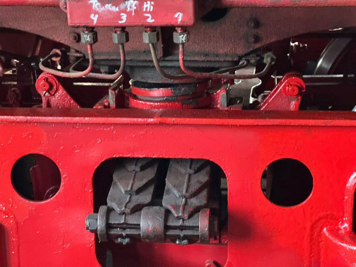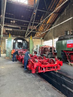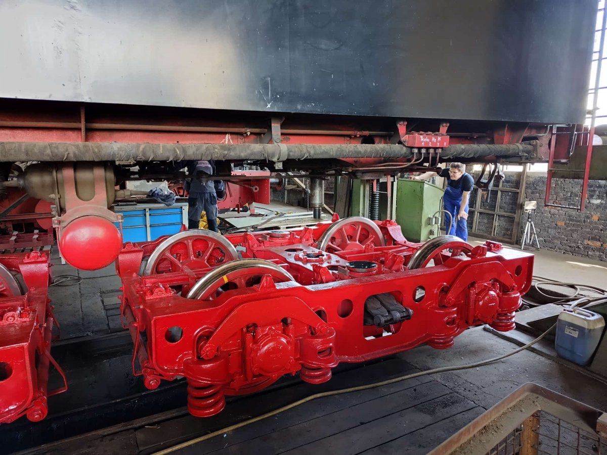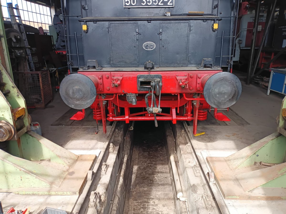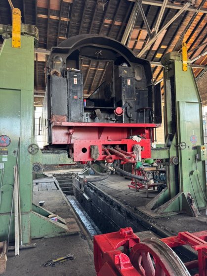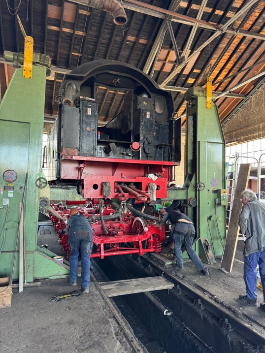 Nachdem in den letzten Wochen die umfangreichen Nacharbeiten an den Tenderehgestellen abgeschlossen werden konnten, wurden am vergangenen Samstag die Tenderdrehgestelle wieder unter den Tender gesetzt. Anschließend konnten die noch fehlenden Anbauteile, wie Tritte, Griffe und Bahnräumer montiert und der Tender mit der Lok gekuppelt werden.