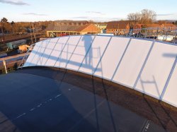 In der vergangenen Woche wurde seitens der Baufirma mit der Montage der Acrylglasplatten der Lichtbänder unseres Rechtechschuppens begonnen.