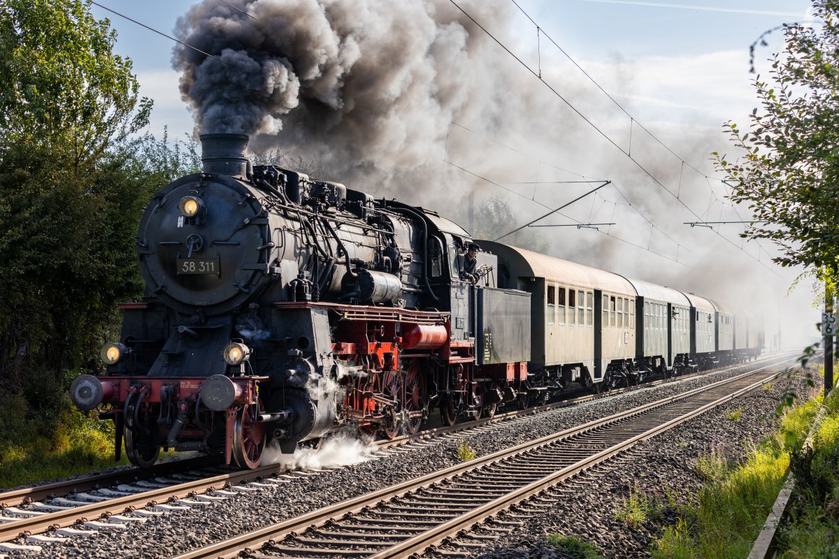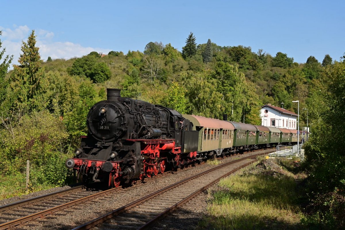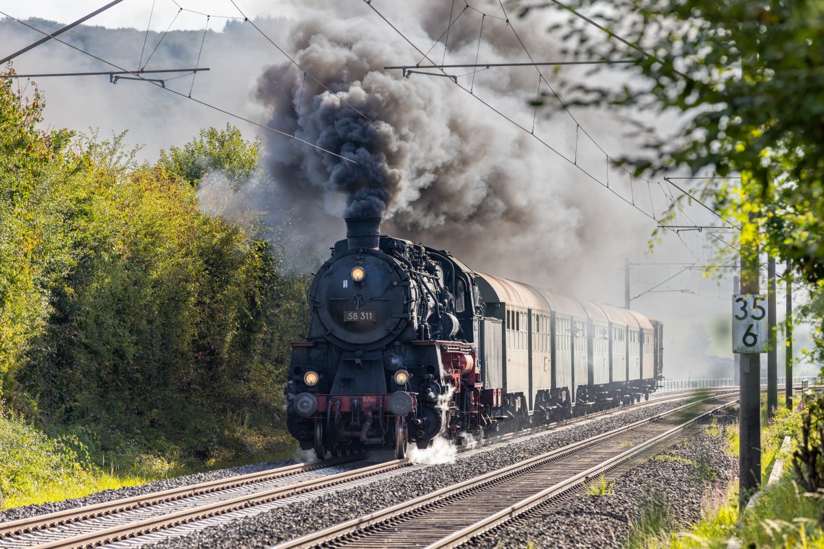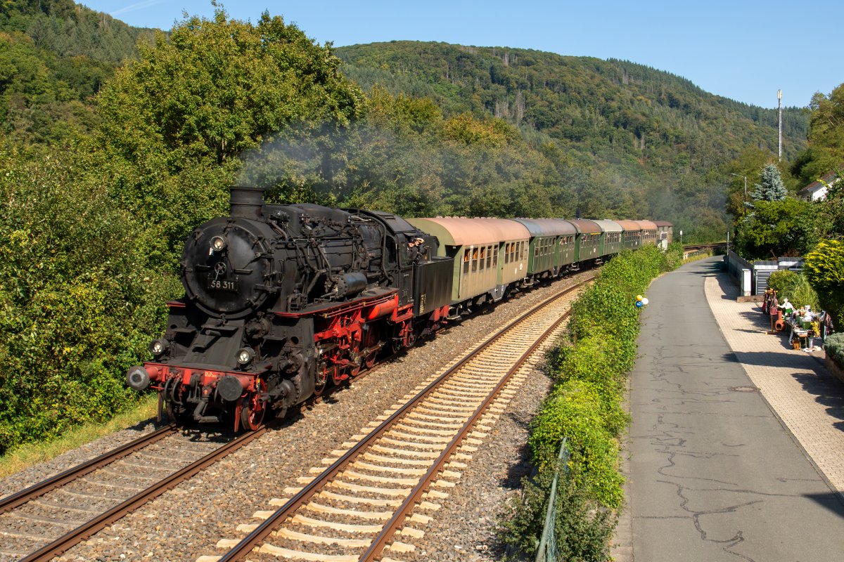 Bei bestem spätsömmerlichen Wetter fuhr unser Sonderzug von Hanau, gezogen von der 58 311 der Dampfnostalgie Karlsruhe, anlässlich des Tags der Schiene mit Einstiegshalten in Frankfurt (Main) Süd, Frankfurt (Main), Hofheim (Ts) und Lorbach nach Koblenz.