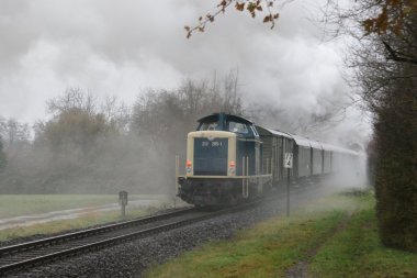 Einzige sinnvolle Umleitungsmöglichkeit war nun die Fahrt über Seligenstadt und Babenhausen, um dann ab Aschaffenburg wieder den regulären Fahrtweg nutzen zu können. Die Umleitung brachte natürlich entsprechend längere Fahrzeiten mit sich, sodaß wir uns entschieden, mit einer zweiten Lokomotive zu fahren, um jeweils das Umsetzen zu vermeiden und somit die Wendezeiten zwischendurch kurz zu halten. Dankenswerterweise konnten wir kurzfristig bei der KonRail GmbH eine Diesellok der Baureihe V 100 (sogar in historischem Farbbild) organisieren. So dass auf Teilstrecken entweder die Dampflok oder die Diesellok den Zug zog.