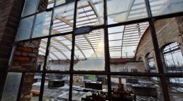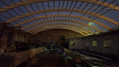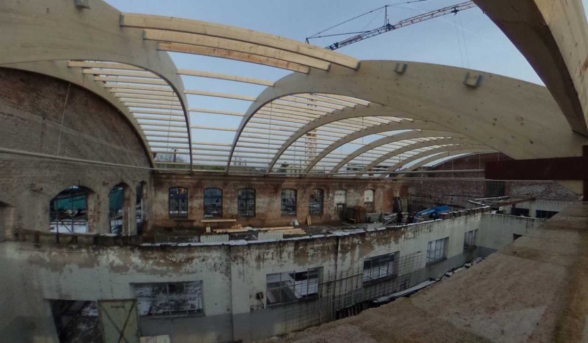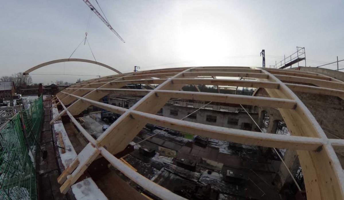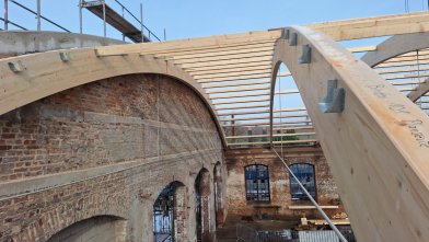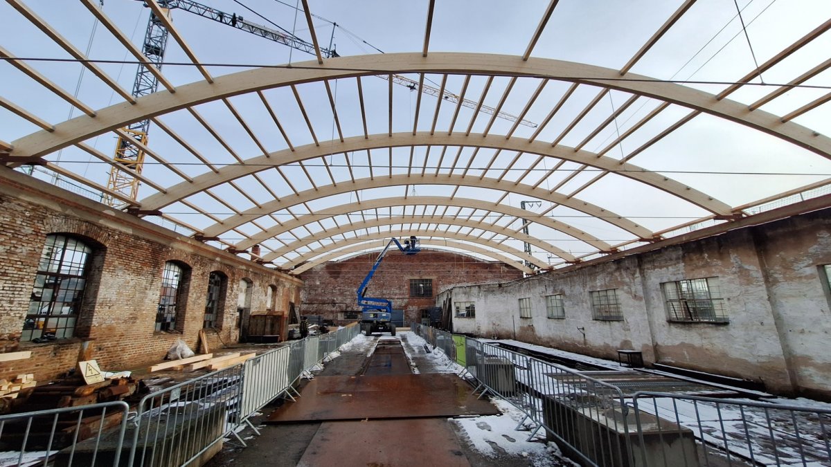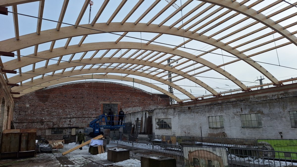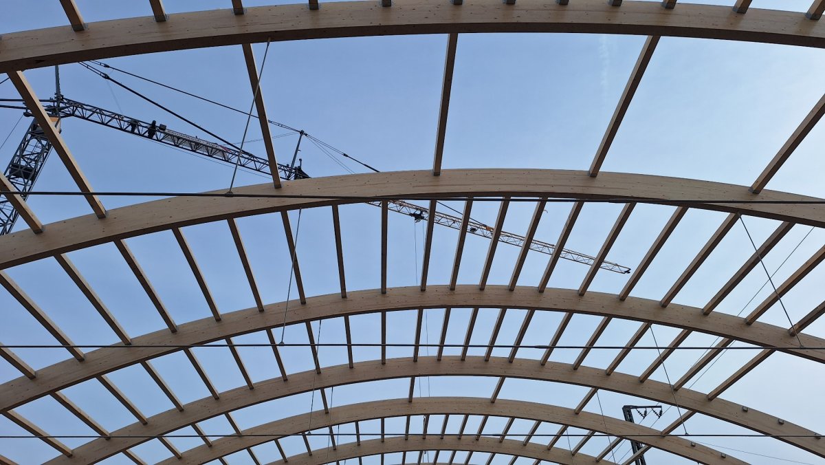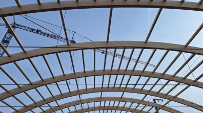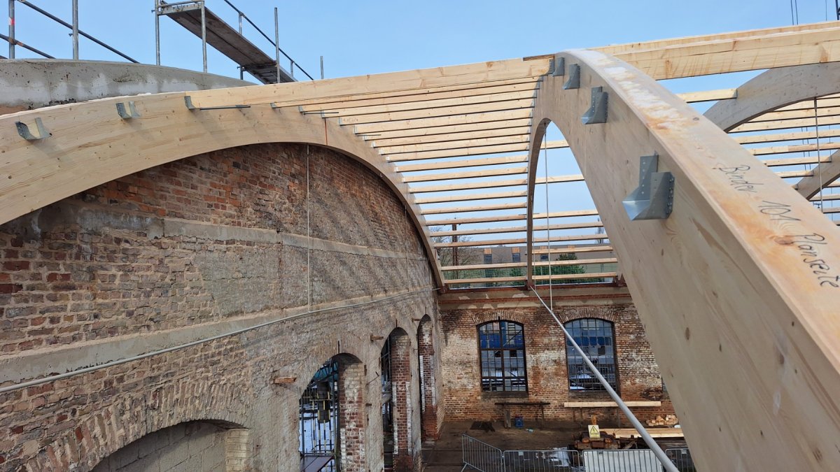 Die Baufirma hat alle zehn Dachbinder montiert und einen Großteil der Pfetten eingebracht.