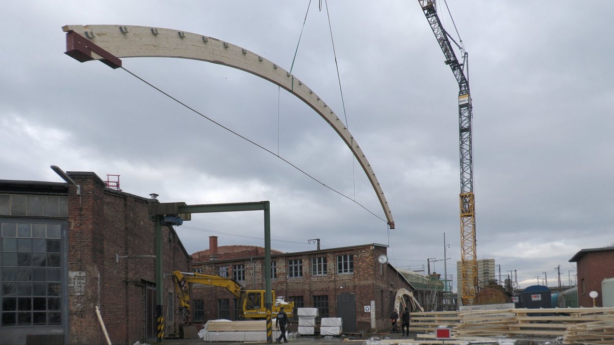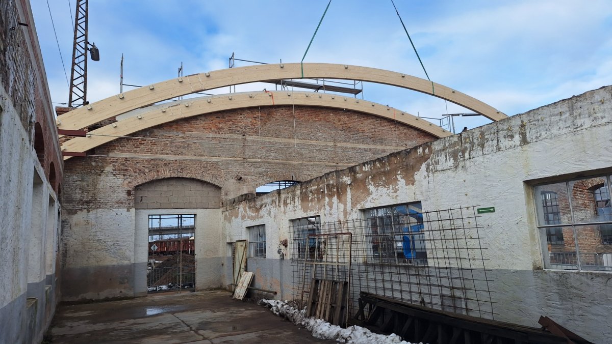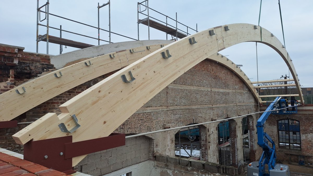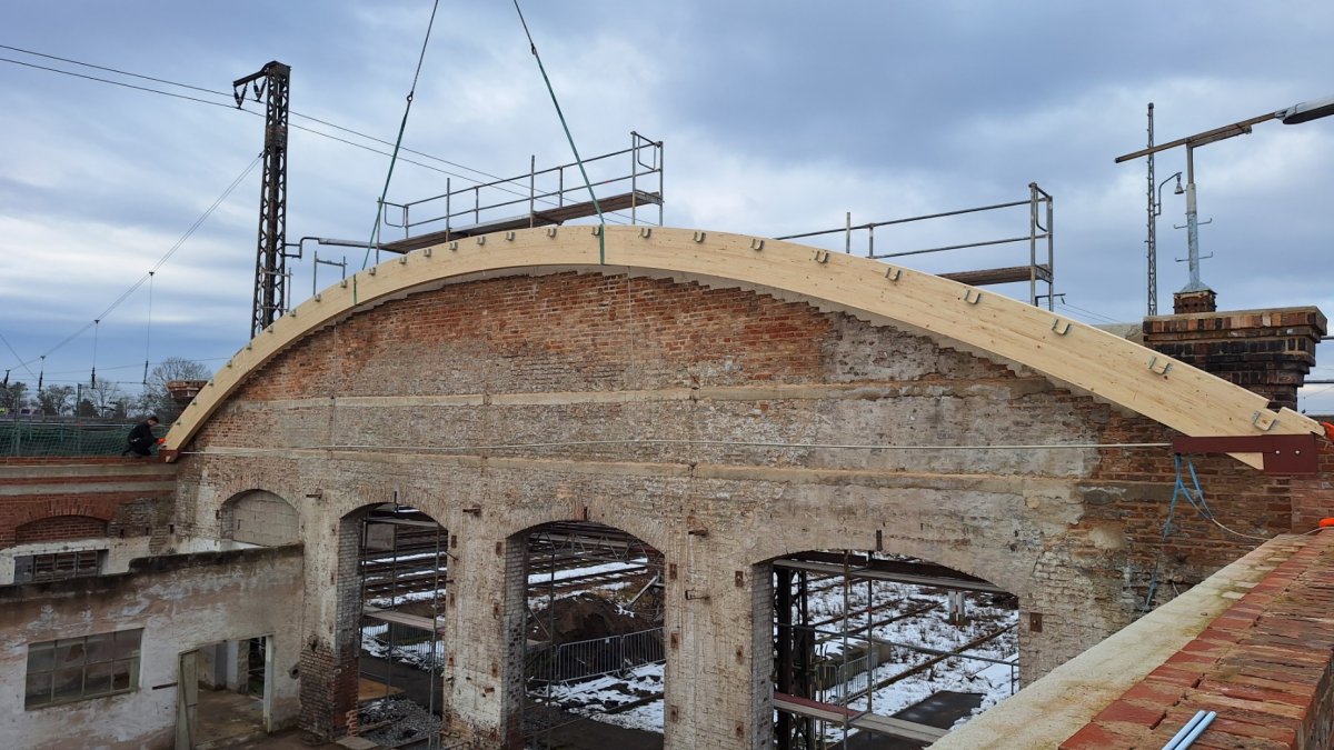 In den nächsten Tagen, werden die weiteren Dachbinder montiert werden und es werden noch weitere vier Dachbinder im historischen Bahnbetriebswerk eintreffen.