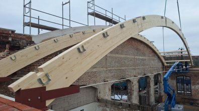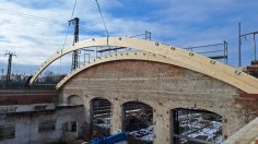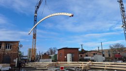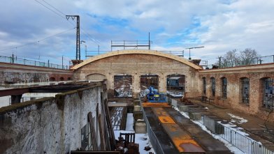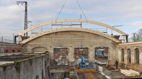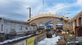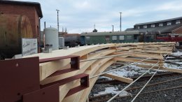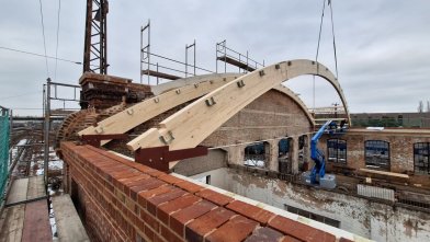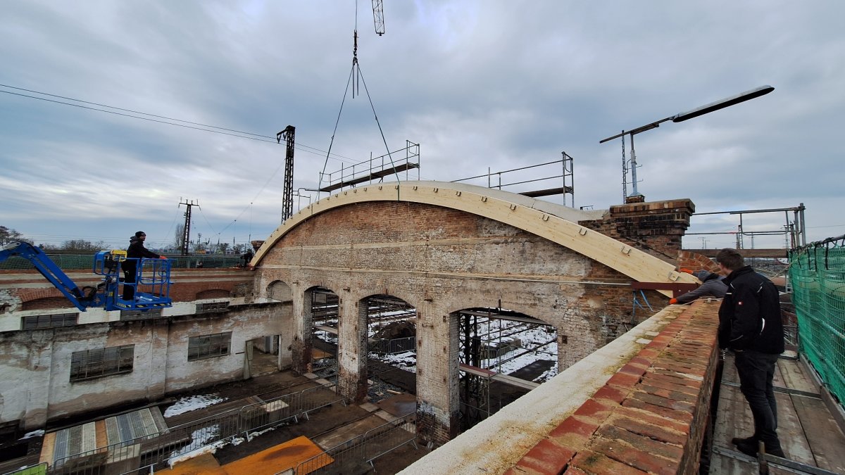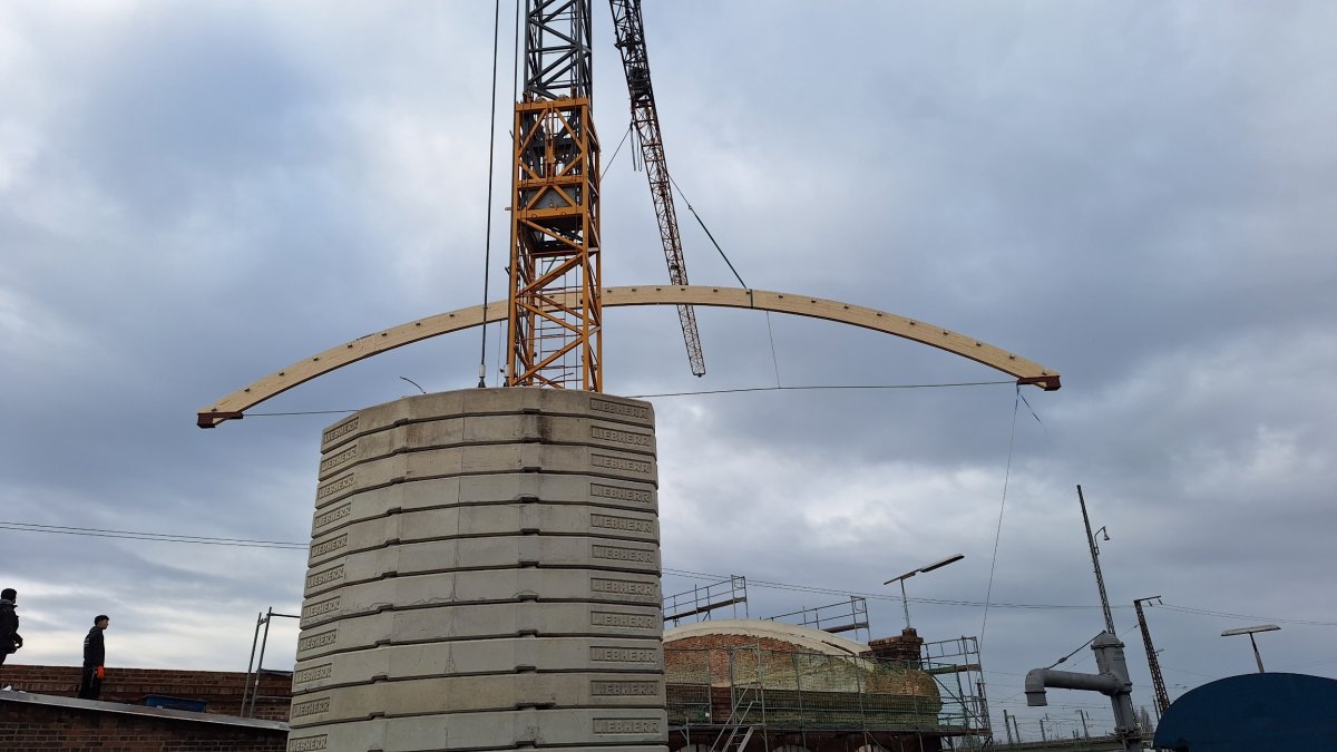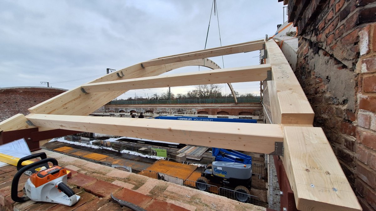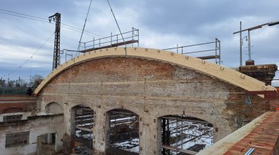 In den nächsten Tagen, werden die weiteren Dachbinder montiert werden und es werden noch weitere vier Dachbinder im historischen Bahnbetriebswerk eintreffen.