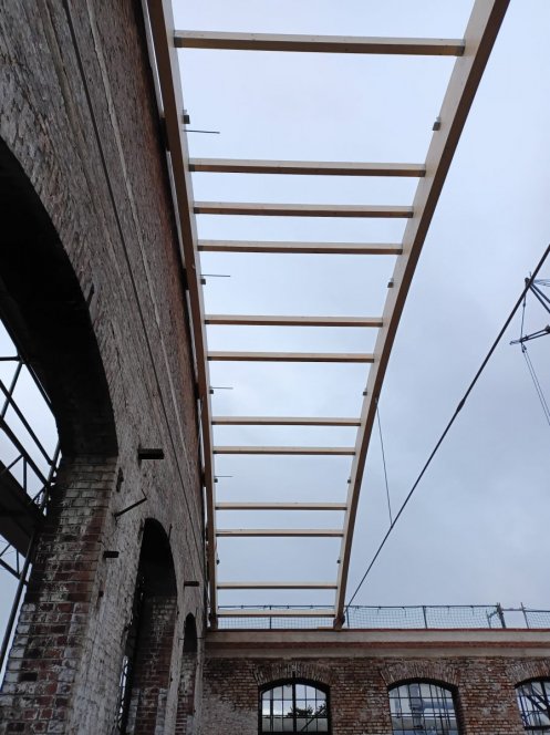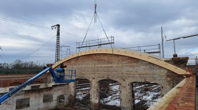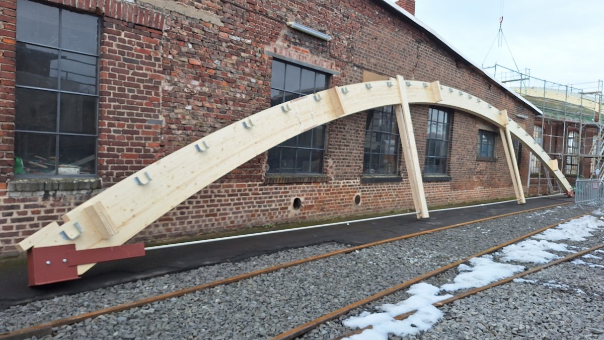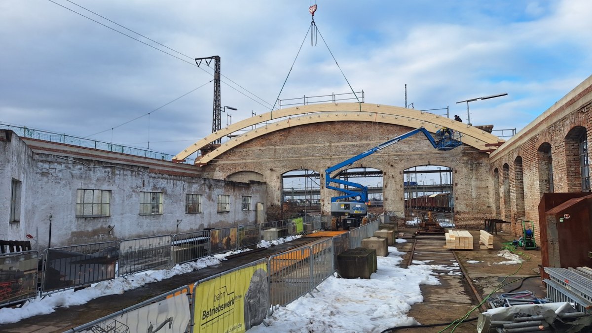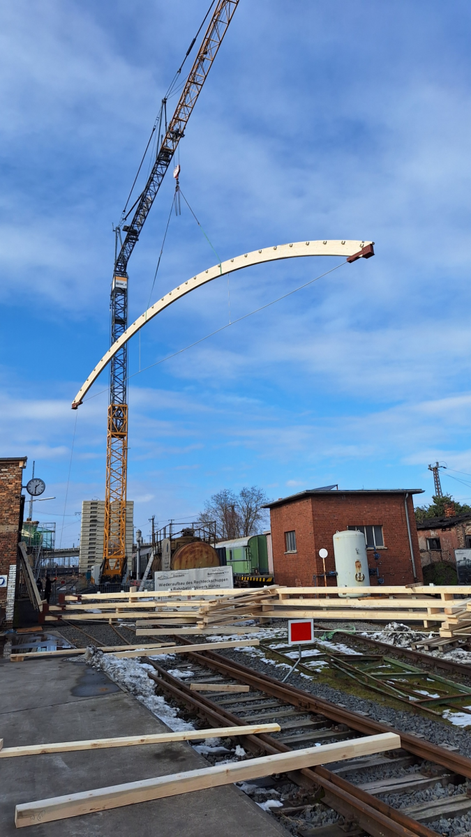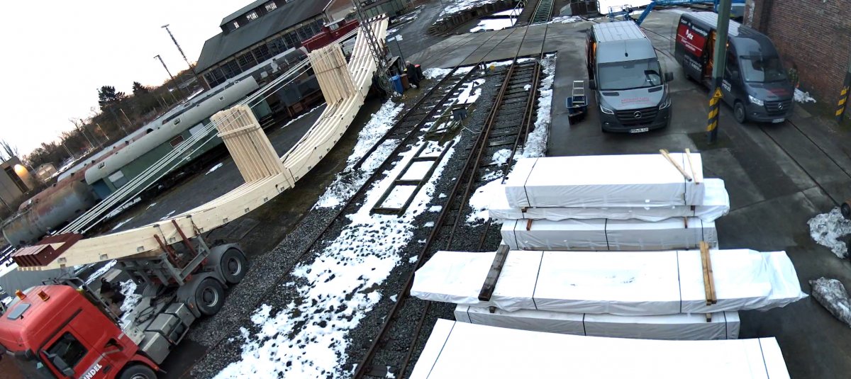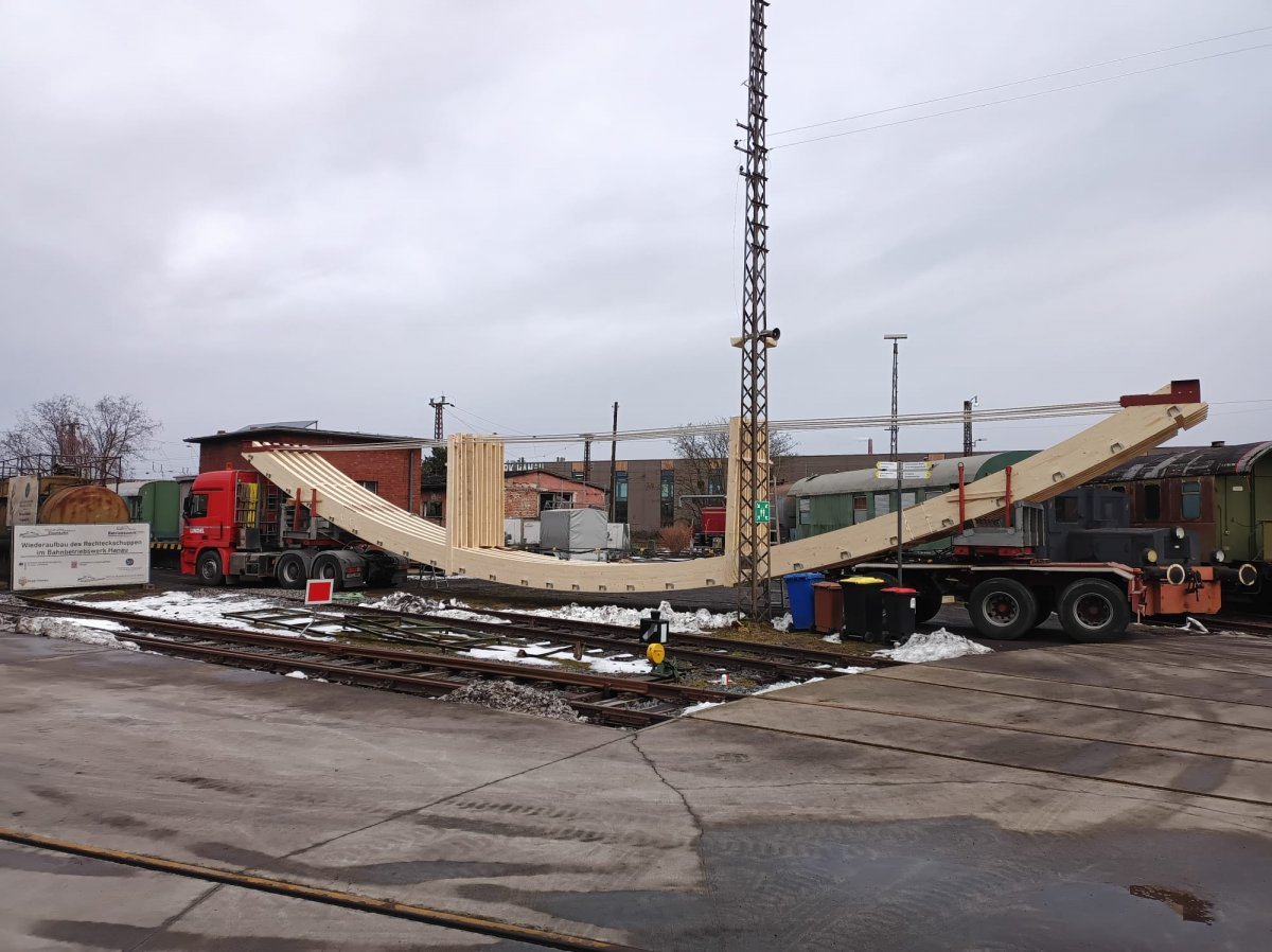 Am Montag, den 02. Februar 2026, traf morgens der Transporter mit sechs Dachbindern im historischen Bahnbetriebswerk ein. Somit konnten die ersehnten Dacharbeiten endlich beginnen.