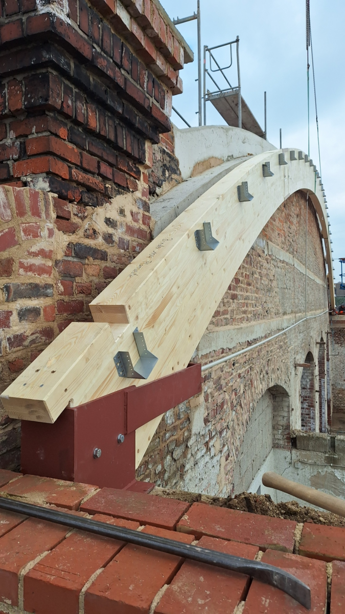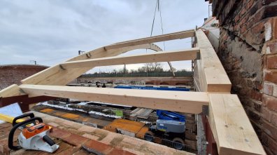 Die sechs Dachbinder wurden von der Baufirma mit dem für die Baustelle aufgestellten Baukran abgeladen. Anschließend wurde der erste Dachbinder auf das Mauerwerk des Rechteckschuppens gehoben.