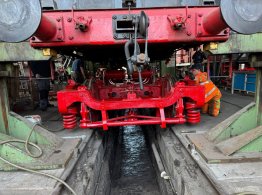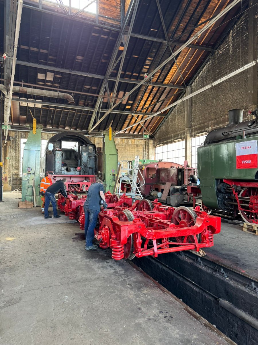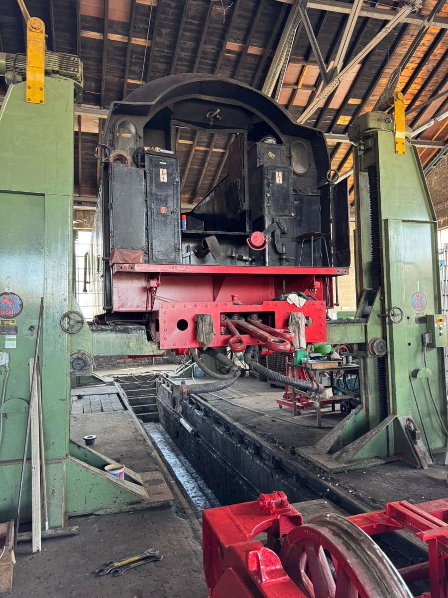 Nachdem in den letzten Wochen die umfangreichen Nacharbeiten an den Tenderehgestellen abgeschlossen werden konnten, wurden am vergangenen Samstag die Tenderdrehgestelle wieder unter den Tender gesetzt. Anschließend konnten die noch fehlenden Anbauteile, wie Tritte, Griffe und Bahnräumer montiert und der Tender mit der Lok gekuppelt werden.