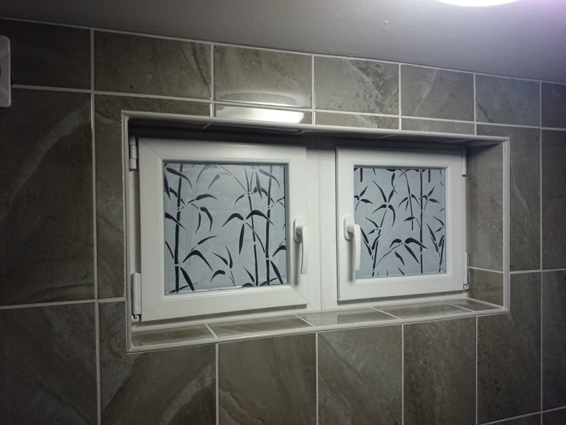 Unter anderem wurden eine Verbindungstür zwischen dem WC und der Dusche eingebaut, die bestehende Tür vermauert und dafür ein zusätzliches Fenster eingebaut, Decke und Wände isoliert, der Boden erneuert, Zu- und Abwasser verlegt, ein Durchlauferhitzer eingebaut, die Elektroinstallation eingebaut, gefließt und gestrichen.