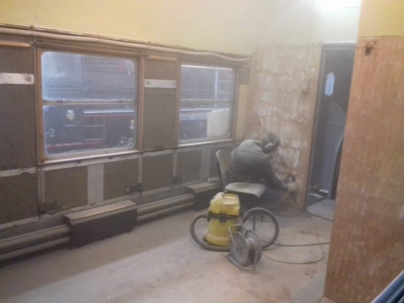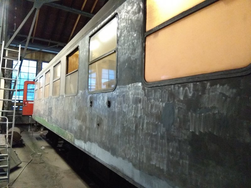 Erster Wagen wird der B3yg „86 306“ sein. Hier möchten wir entsprechend dem Originalzustand die fehlenden Gepäckablagen wieder einbauen, die Seitenwände wieder mit Kunstleder verkleiden und die fehlenden Zierleisten neu anfertigen und einbauen. Am vergangenen Wochenende wurde dazu das erste Abteil demontiert und die Wände abgeschliffen. Parallel wurden die Vorräume neu lackiert und mit den Lackarbeiten an der zweiten Außenseite begonnen.