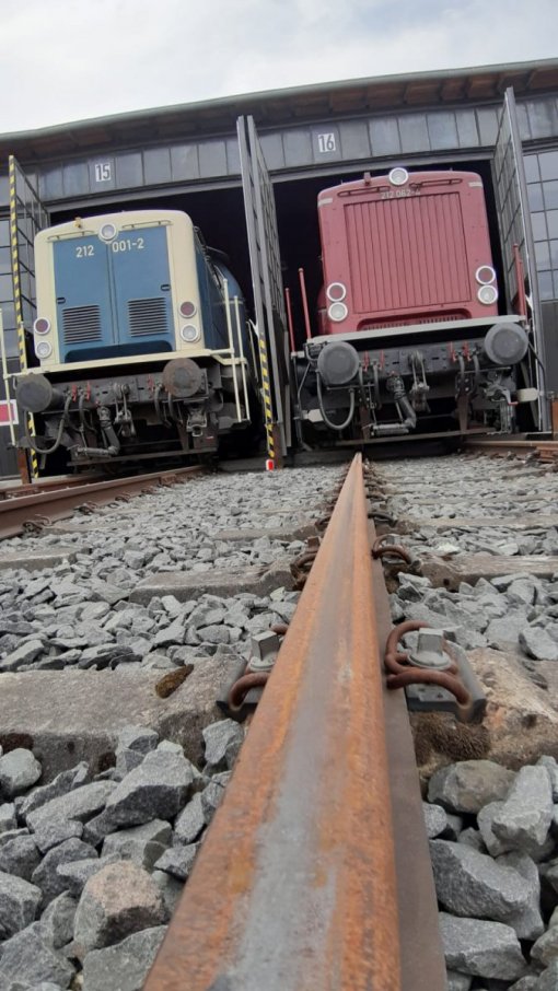 - Während Rangierarbeiten zeigten sich 212 001 und 212 062 nebeneinander im Lokschuppen Süd.