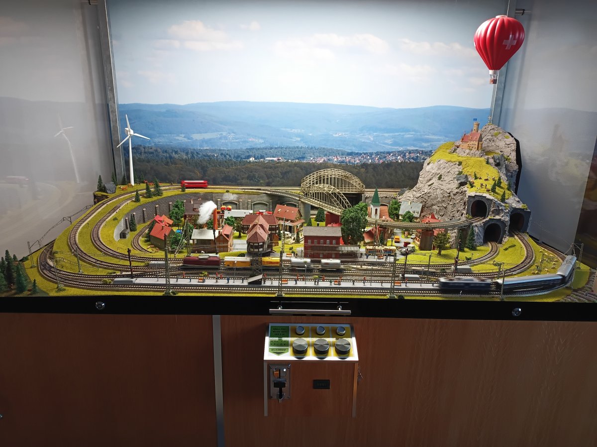 Für unseren neu gestalteten Eingangsbereich, der im Stil einer Schalterhalle eines Kleinstadtbahnhofs gehalten ist, suchten wir eine solche Anlage. Da jedoch keine gebrauchte Anlage verfügbar war, entschieden wir uns, eine neue zu bauen. Diese ist nun fertiggestellt und ab sofort nutzbar.