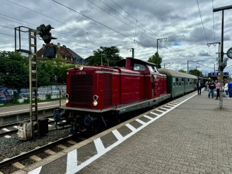 In Frankfurt (M) Süd wartete schon der Zug der Dampfnostalgie Karlsruhe auf uns, welcher aus drei Personenwagen und einem Speisewagen gebildet wurde und von Ettlingen nach Frankfurt (M) Süd von der V100 1019 gezogen wurde.