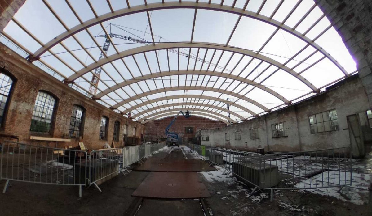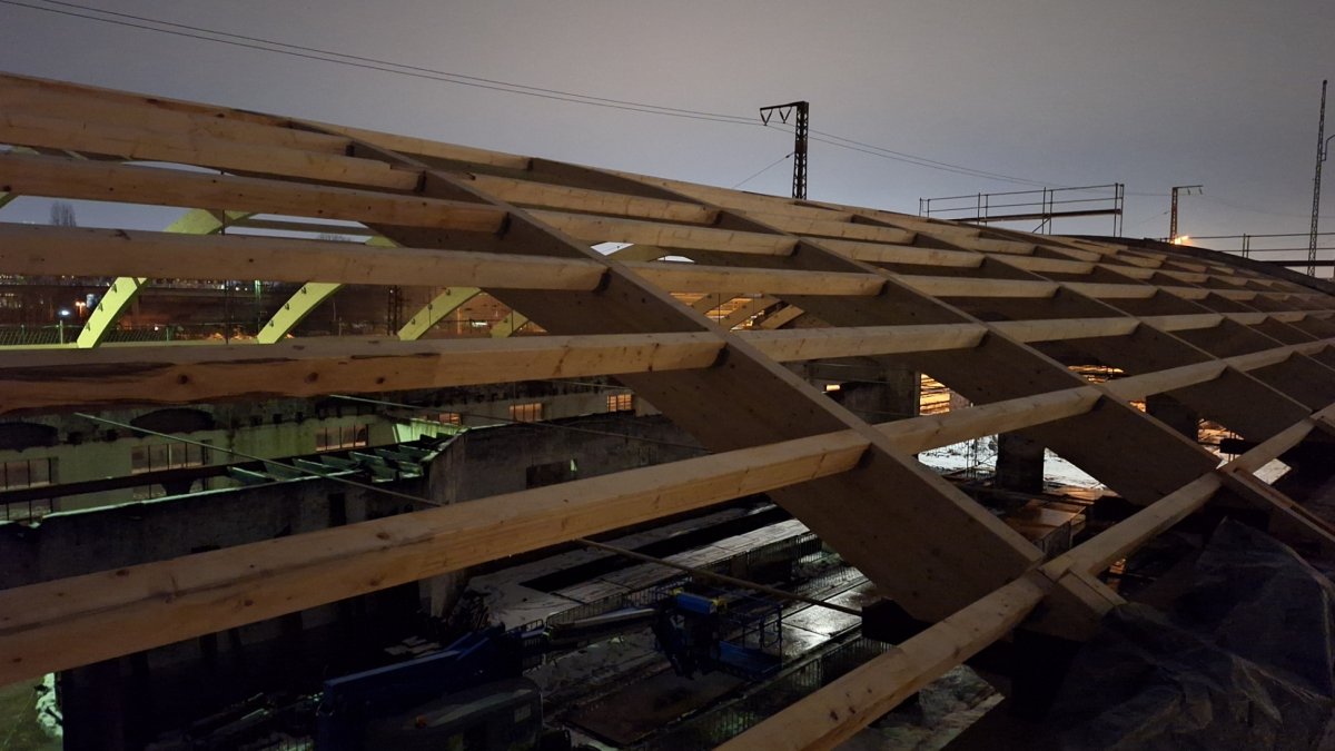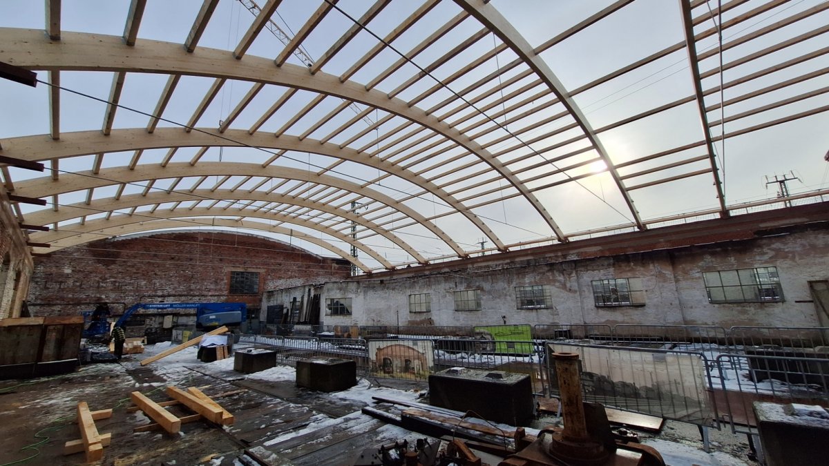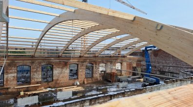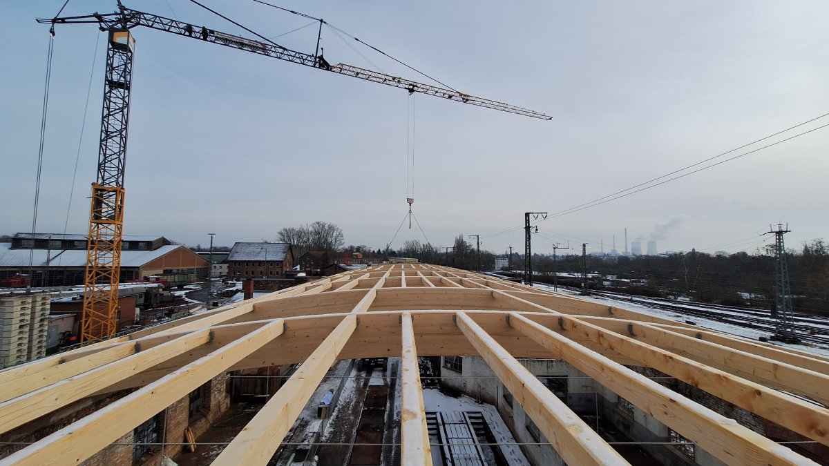 Die Baufirma hat alle zehn Dachbinder montiert und einen Großteil der Pfetten eingebracht.