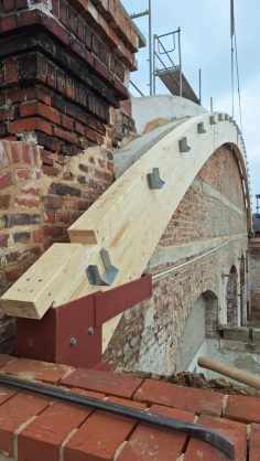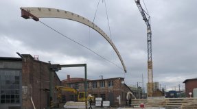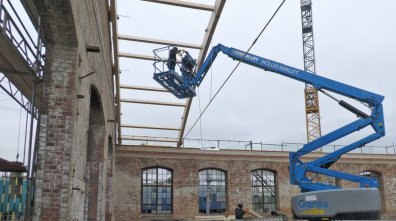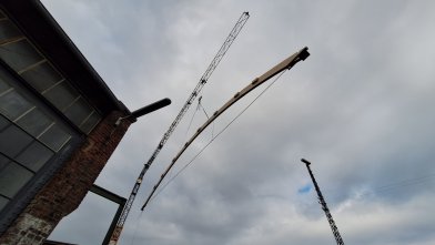 Die sechs Dachbinder wurden von der Baufirma mit dem für die Baustelle aufgestellten Baukran abgeladen. Anschließend wurde der erste Dachbinder auf das Mauerwerk des Rechteckschuppens gehoben.