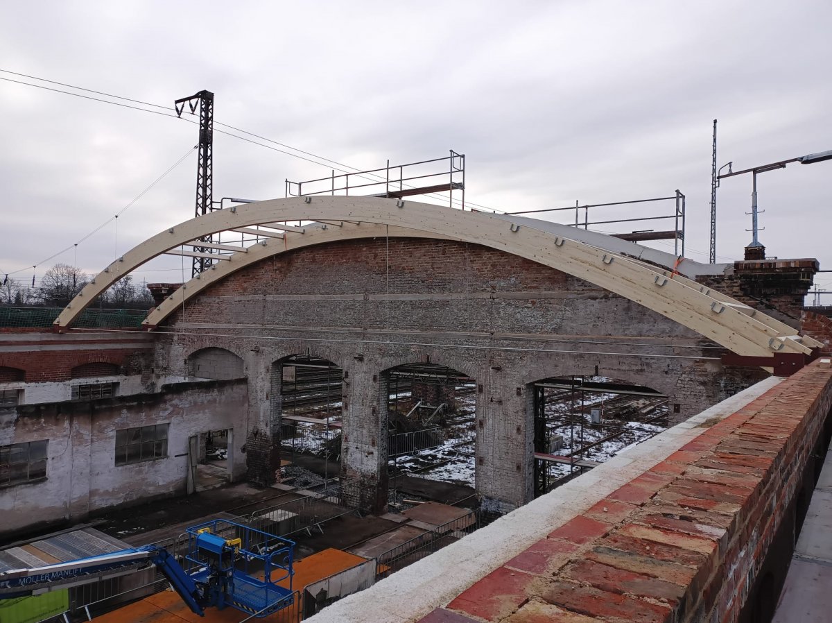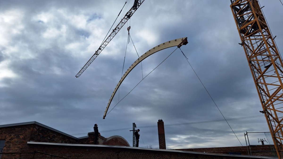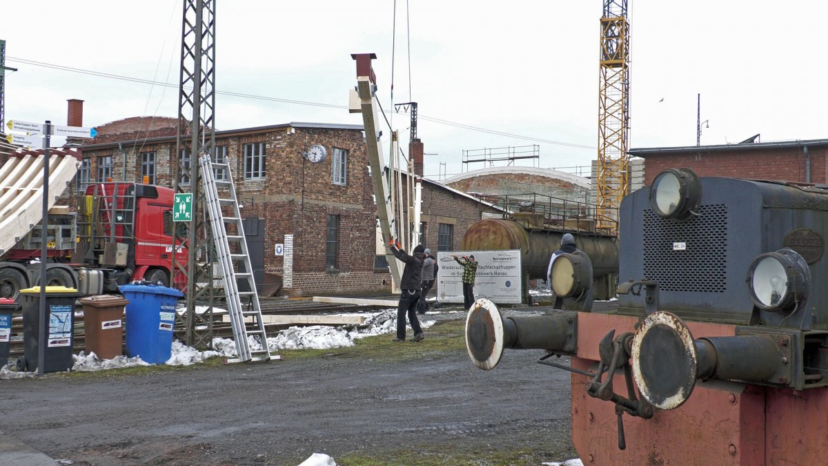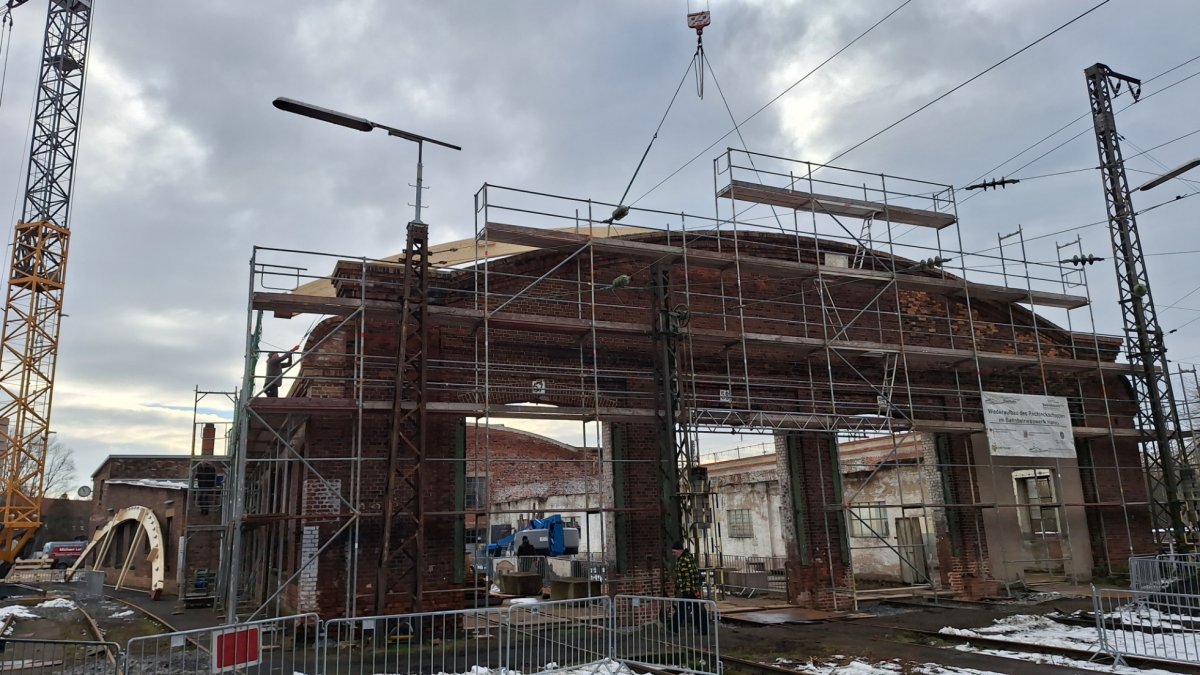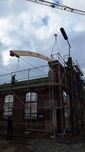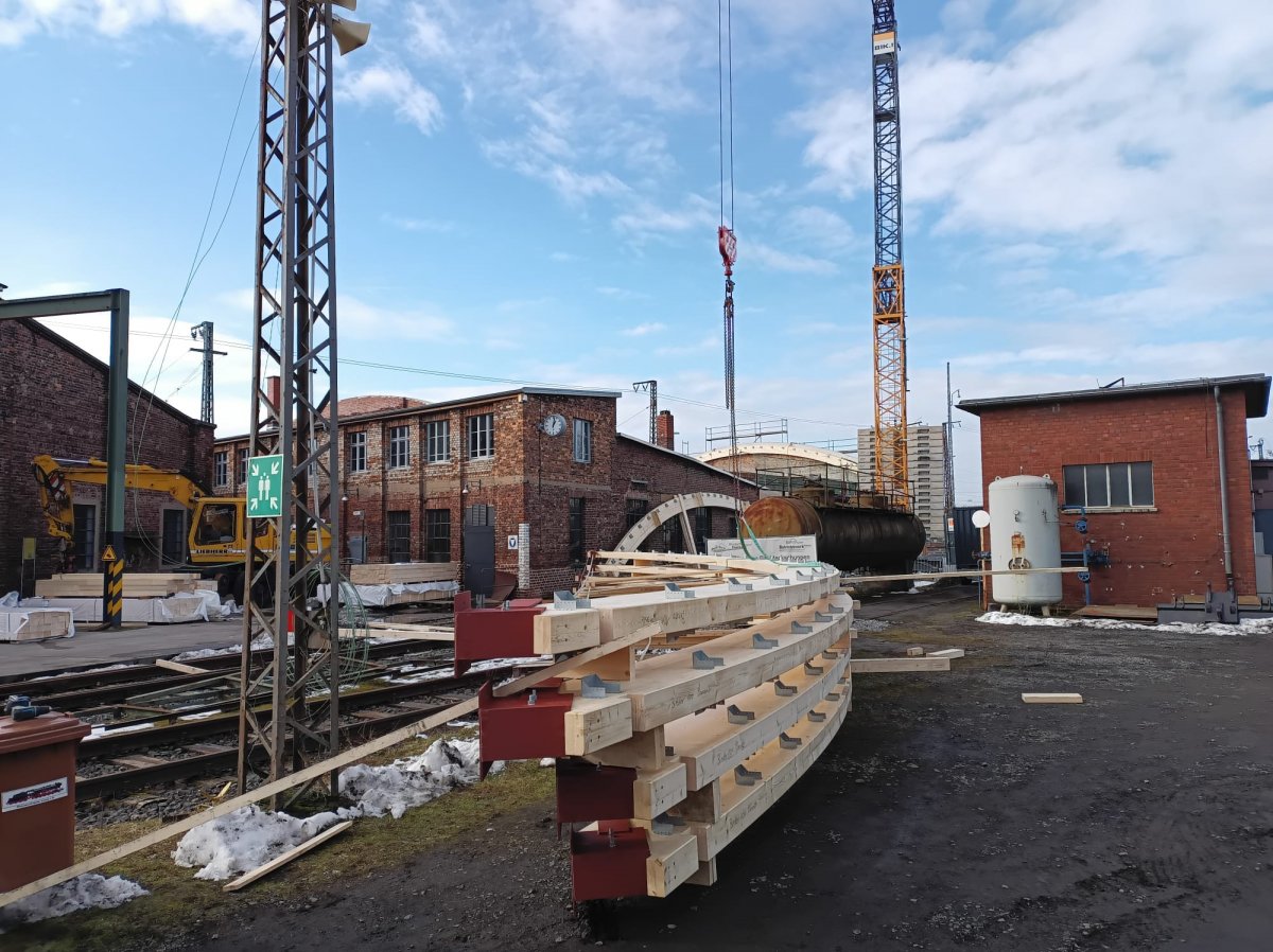 In den nächsten Tagen, werden die weiteren Dachbinder montiert werden und es werden noch weitere vier Dachbinder im historischen Bahnbetriebswerk eintreffen.