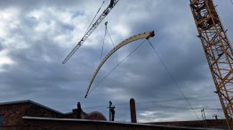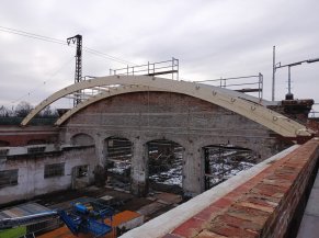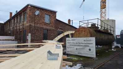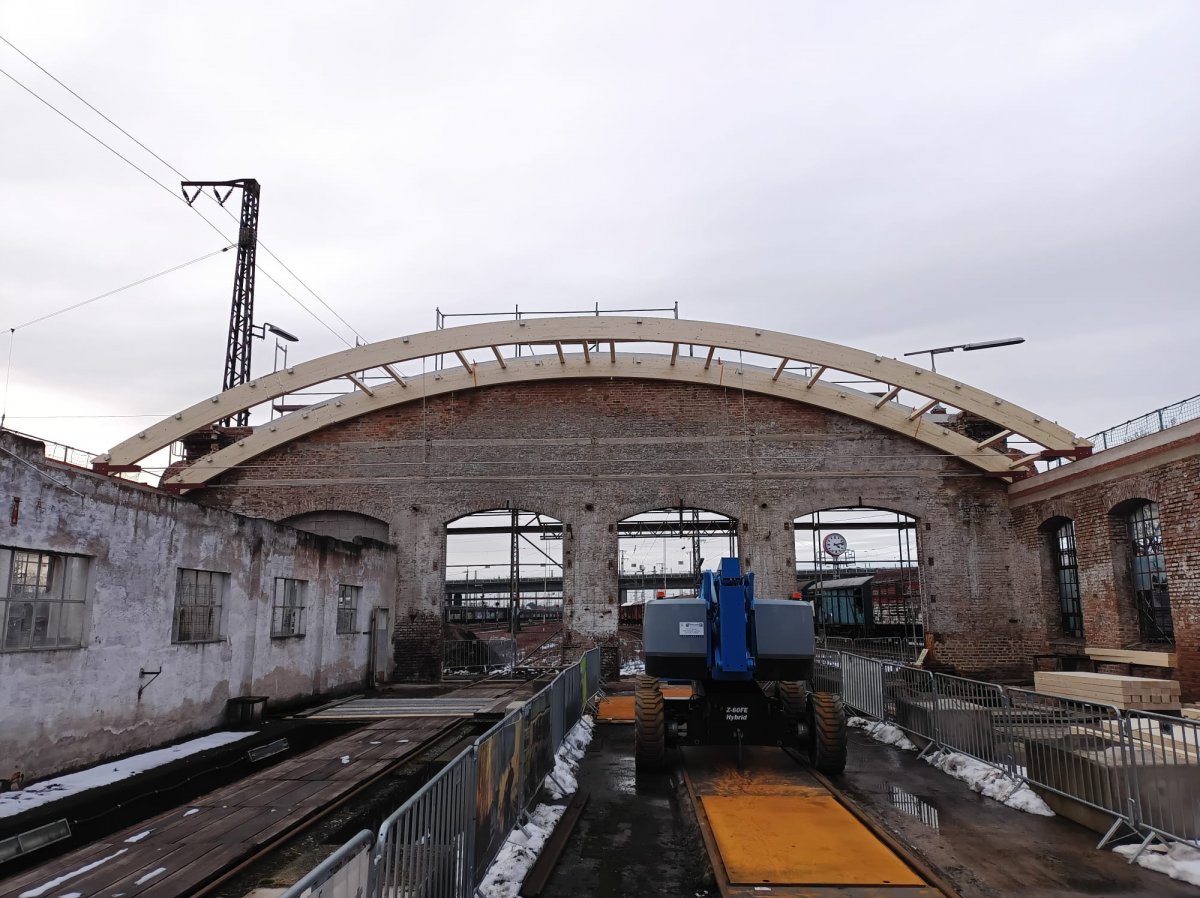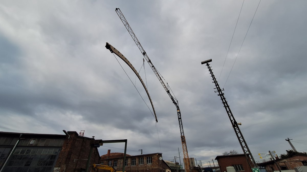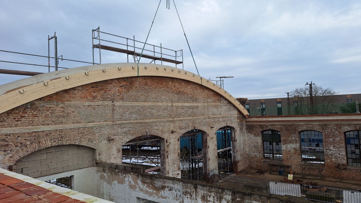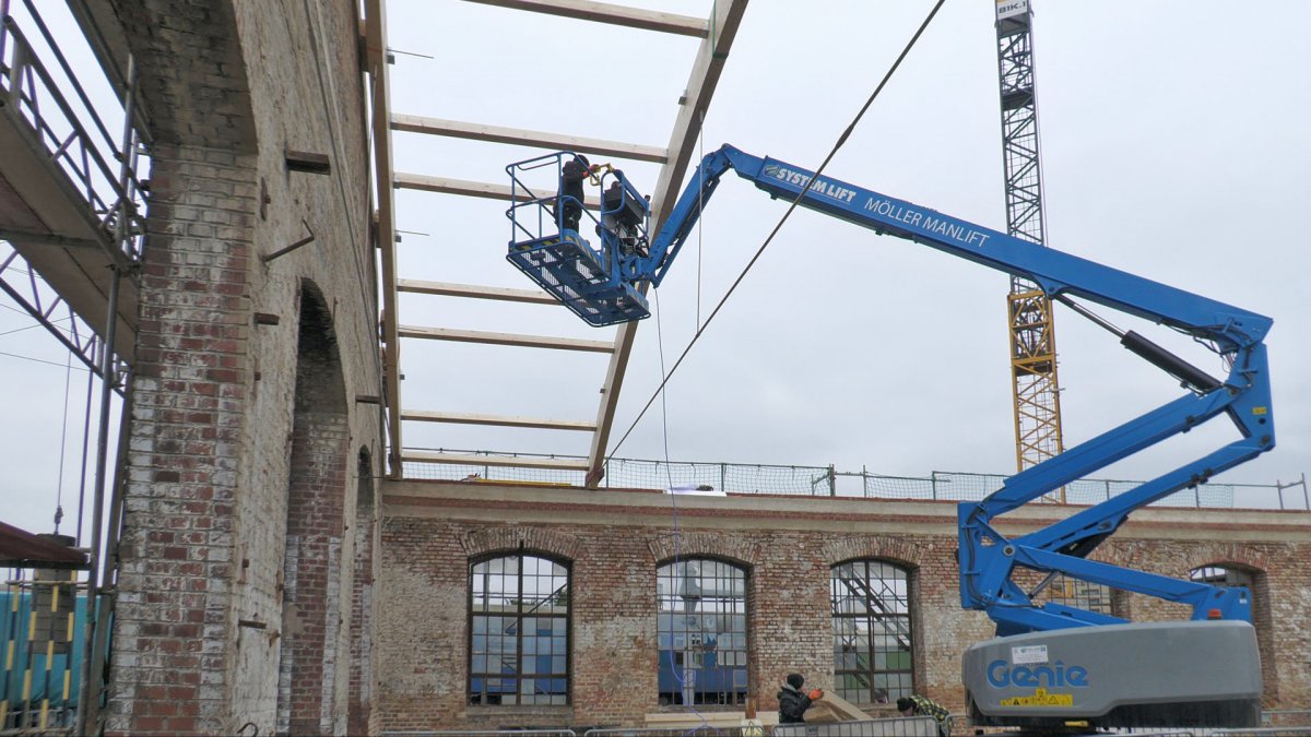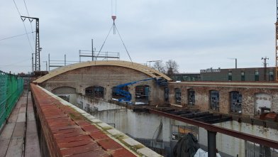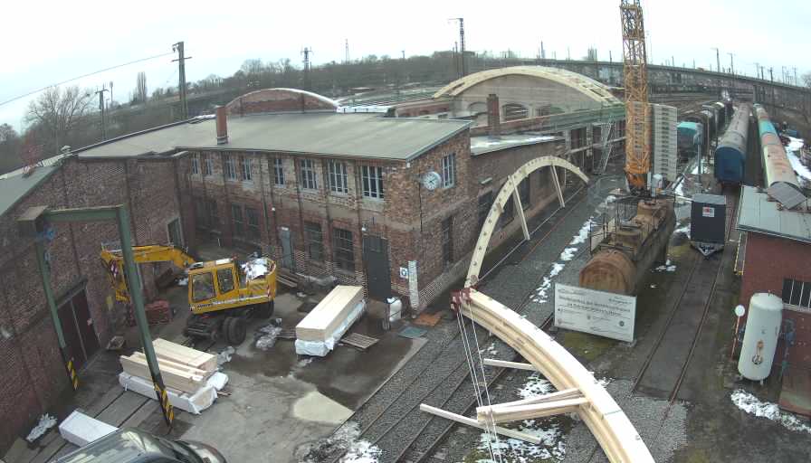 In den nächsten Tagen, werden die weiteren Dachbinder montiert werden und es werden noch weitere vier Dachbinder im historischen Bahnbetriebswerk eintreffen.