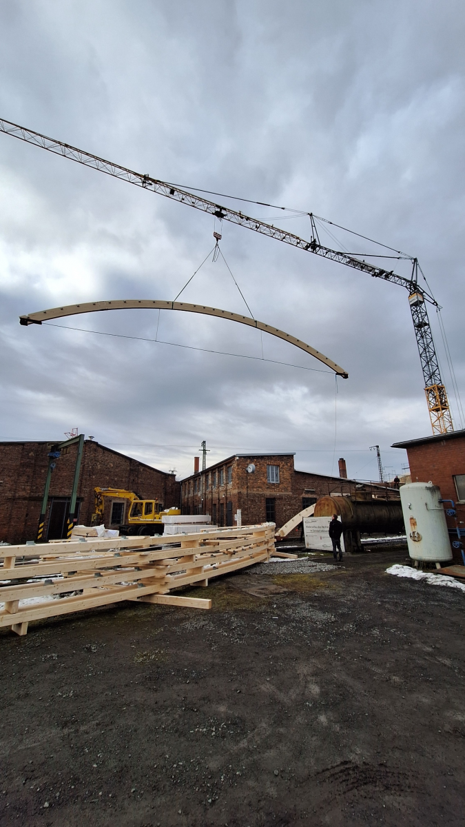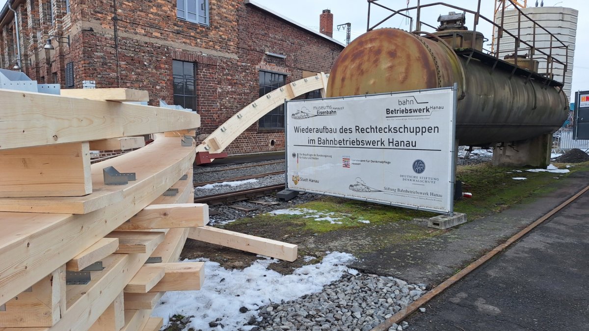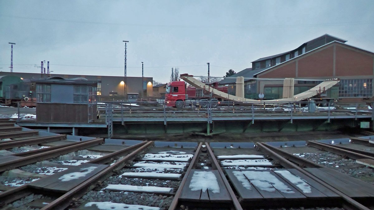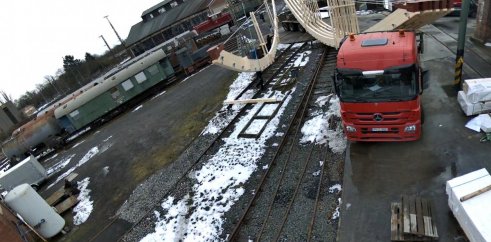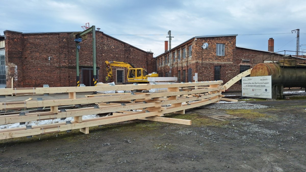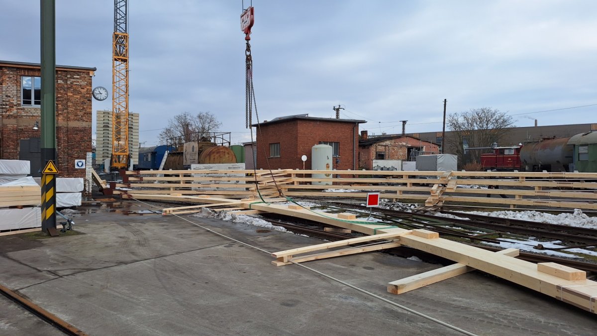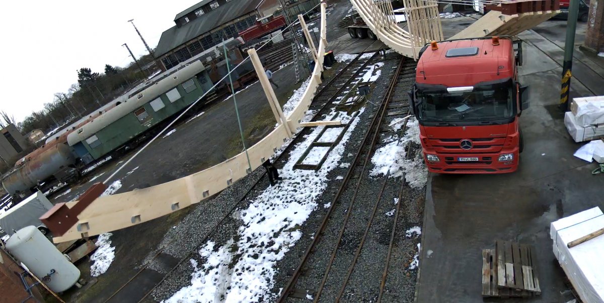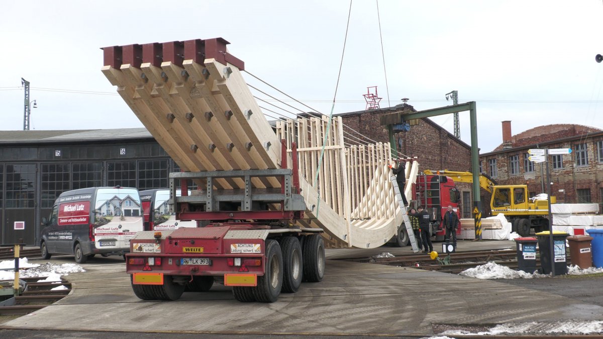 Am Montag, den 02. Februar 2026, traf morgens der Transporter mit sechs Dachbindern im historischen Bahnbetriebswerk ein. Somit konnten die ersehnten Dacharbeiten endlich beginnen.