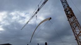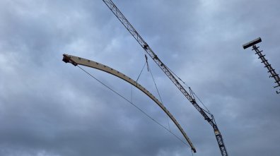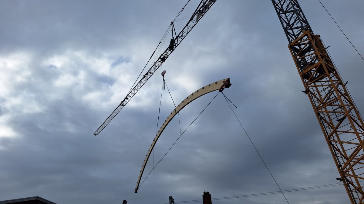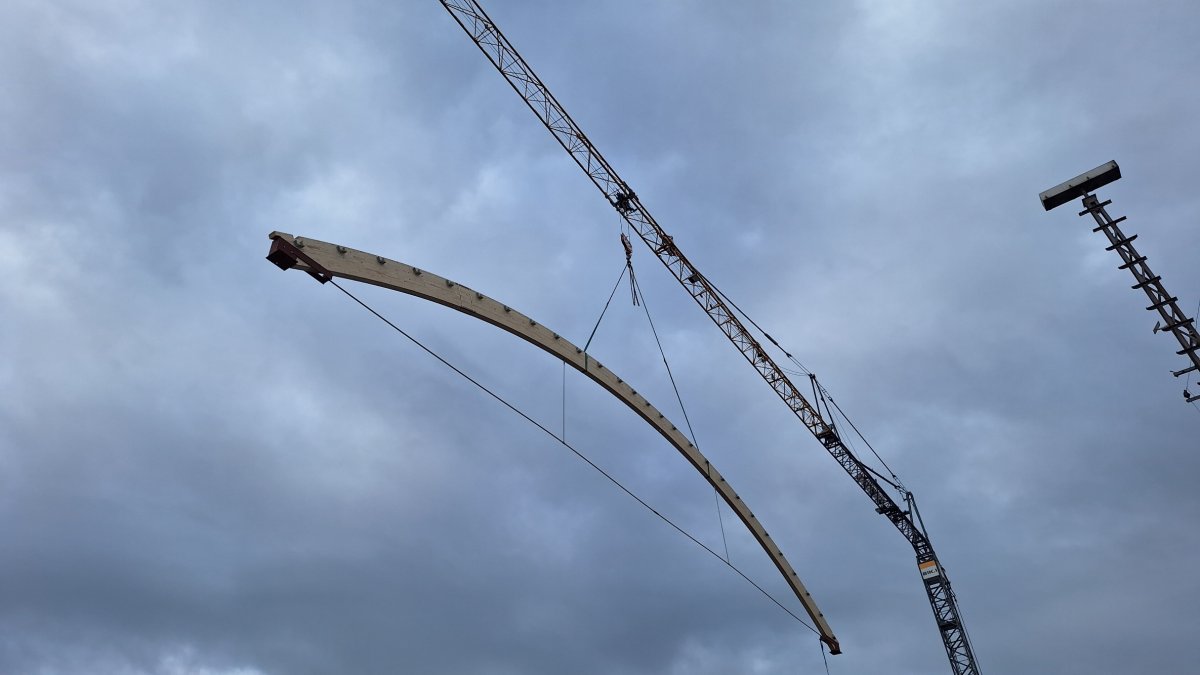 Nachdem der erste Dachbinder gesichert war, wurde der zweite Dachbinder angehoben und mit dem Kran an seinen Bestimmungsort gebracht.