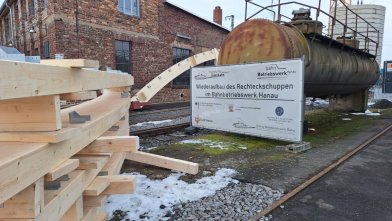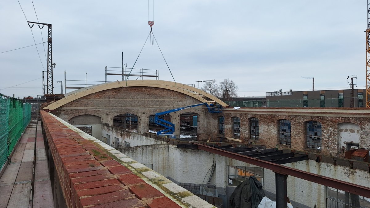 Die Baufirma hat mit der Montage der Dachbinder an der Giebelwand (Außenmauer mit den Einfahrtstoren, Blickrichtung Hanau Hbf) begonnen.