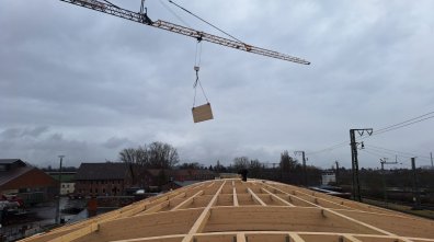 - Mit der Montage der Dachplatten, sowie der Unterkonstruktion für die Dachlichter wurde begonnen.