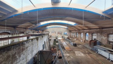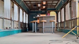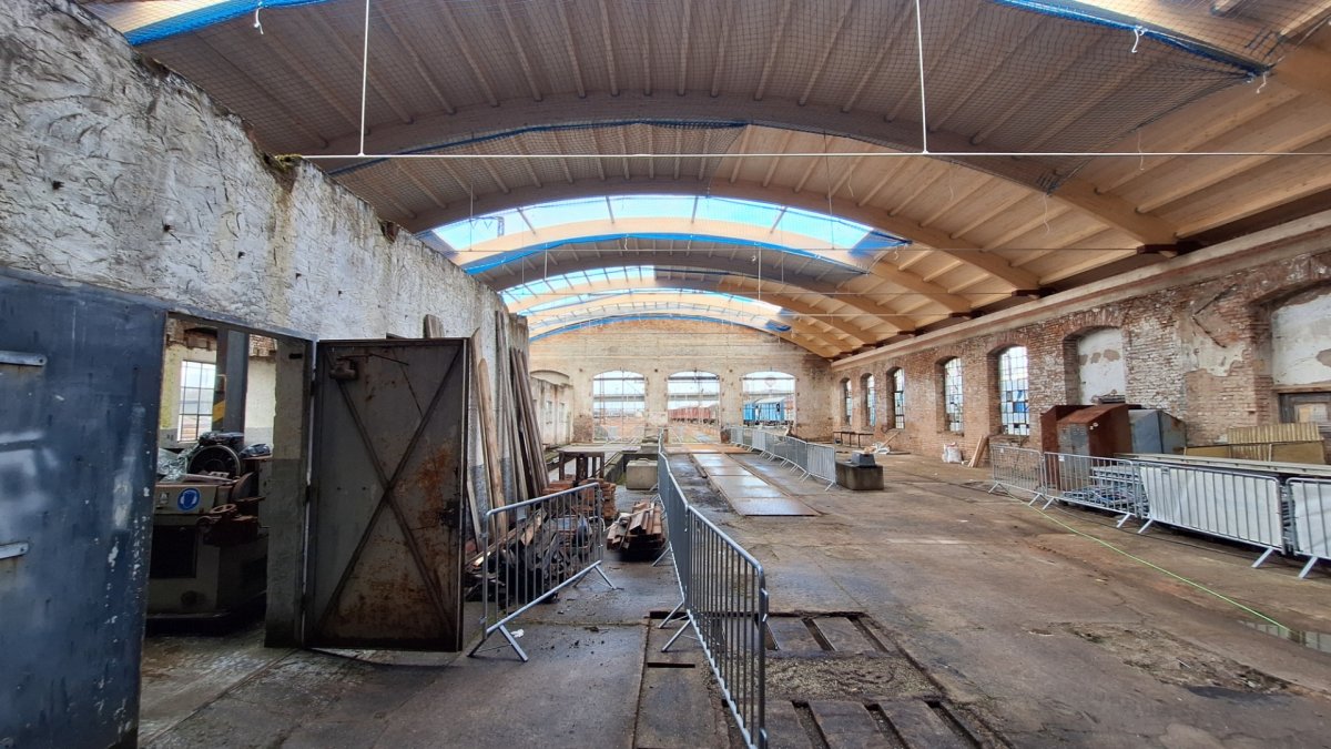 - Zwecks Renovierung der Schuppentore wurden das alte Fensterglas und die Holzbeplankung entfernt.